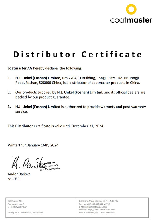 翁開爾公司與瑞士涂魔師Coatmaster公司達(dá)成合作協(xié)議,佛山翁開爾是瑞士涂魔師Coatmaster的中國(guó)區(qū)代理。