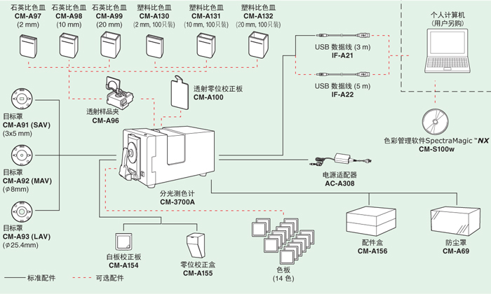 | 標準配件 | 白色校正板CM-A154,零位校正盒CM-A155,3×5mm目標罩CM-A91,Φ8mm目標罩CM-A92,Φ25.4mm目標罩CM-A93,USB線1F-A21,電源適配器AC-A308,配件盒CM-A156,防塵罩CM-A69 |