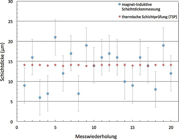 傳統(tǒng)磁感應(yīng)方法與Coatmaster熱層法的涂層厚度對(duì)比,測(cè)試在測(cè)量中的振動(dòng)阻尼環(huán)上進(jìn)行確定