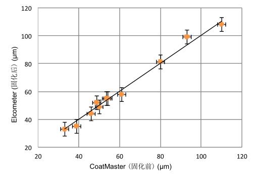 固化前CoatMaster測量值與固化后渦電流比較測量值進(jìn)行比較。 測量值的相關(guān)性是r2 = 0.96,顯示非常好的相關(guān)性。使用CoatMaster重復(fù)測量的變化系數(shù)為1%(測量距離為15 cm),渦電流的變化系數(shù)為5%