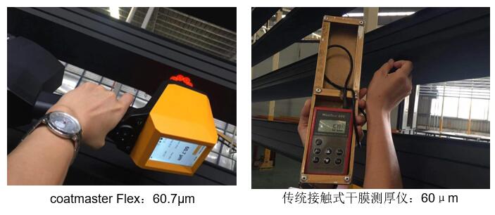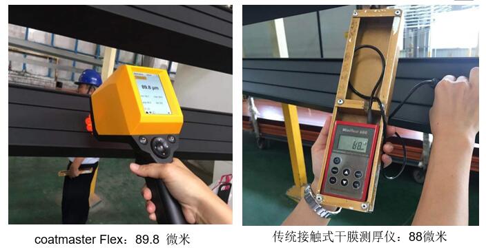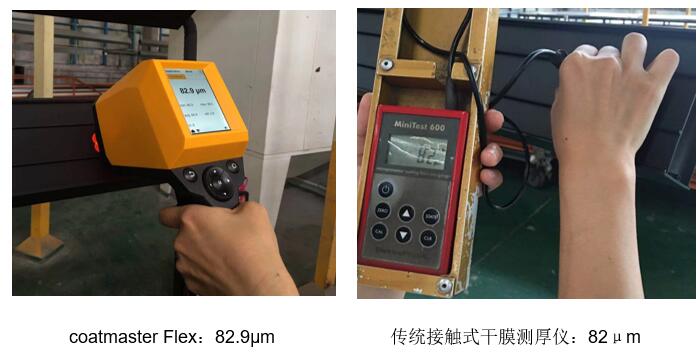 用戶得知手持非接觸膜厚分析儀coatmaster flex可以檢測固化前濕膜厚度后,使用該膜厚分析儀與干膜測厚儀進行對比測試,發(fā)現(xiàn)對鋁型材上相同位置測試數(shù)據(jù)接近,且coatmaster Flex重復性和精度更好;