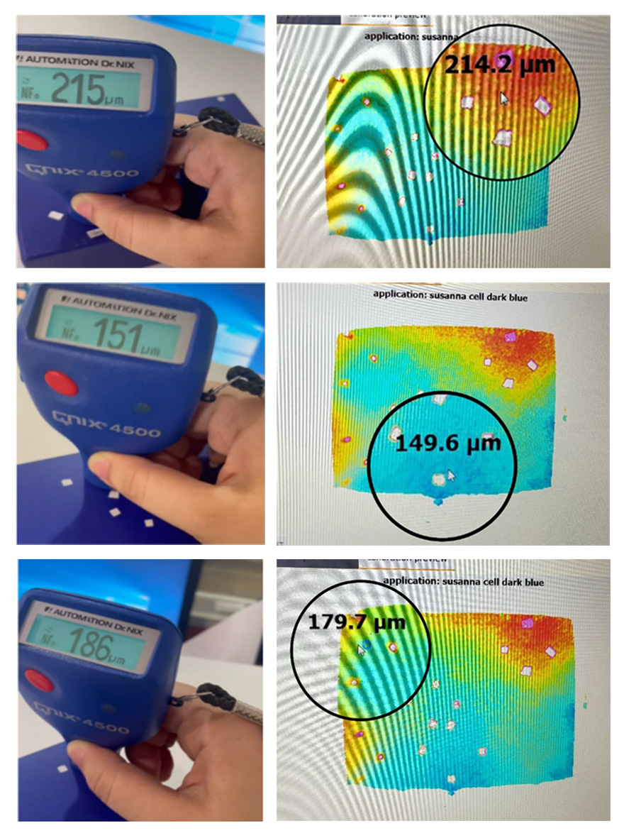 對(duì)于接觸式磁性測(cè)厚儀測(cè)不準(zhǔn)的棱邊和R角等部位,涂魔師也能快速準(zhǔn)確測(cè)量。廠家根據(jù)測(cè)量結(jié)果快速判斷絕緣涂層是否均勻一致、邊角涂覆是否達(dá)到要求,及時(shí)對(duì)涂裝工藝進(jìn)行可視化監(jiān)控與優(yōu)化,提供更智能與高度自動(dòng)化的涂裝工藝測(cè)厚技術(shù)。