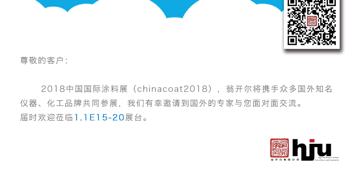 2018中國國際涂料展(chinacoat2018),翁開爾將攜手眾多國外聞名儀器、化工品牌共同參展,我們有幸邀請(qǐng)到國外的專家與您面對(duì)面交流。屆時(shí)歡迎蒞臨1.1E15-20展臺(tái)。
